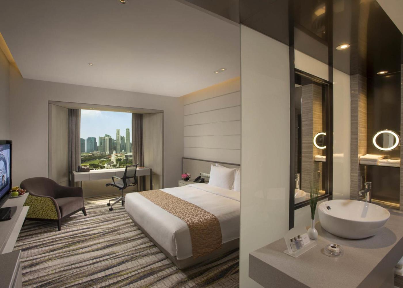 Executive Double or Twin Room. This air-conditioned executive room opens up to views of the city, swimming pool or the bay. The seating area is fitted with a flat-screen Internet Protocol TV (IPTV), a minibar and a safe. The room offers a work space with a Herman Miller chair. The open-plan en suite bathroom includes a bathtub, separate shower facilities and free toiletries. Beds are equipped with a Sealy Posturepedic mattress and down feather and microgel pillows. ;